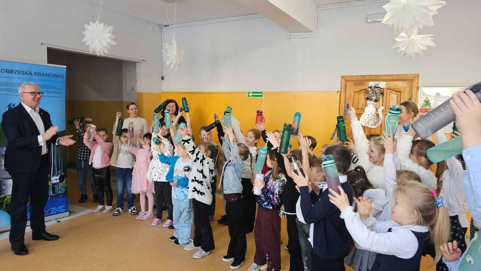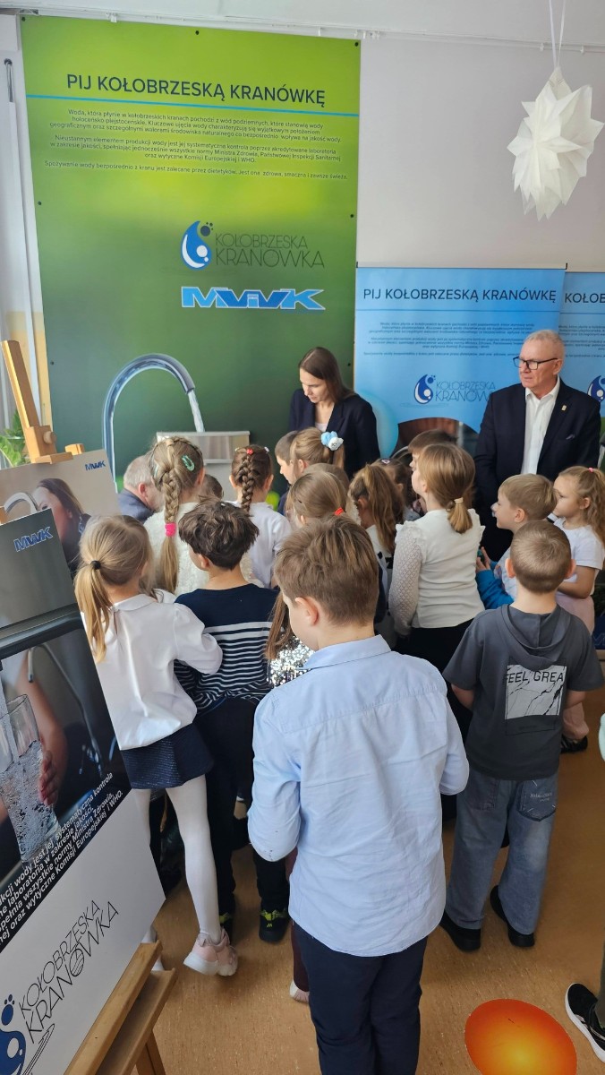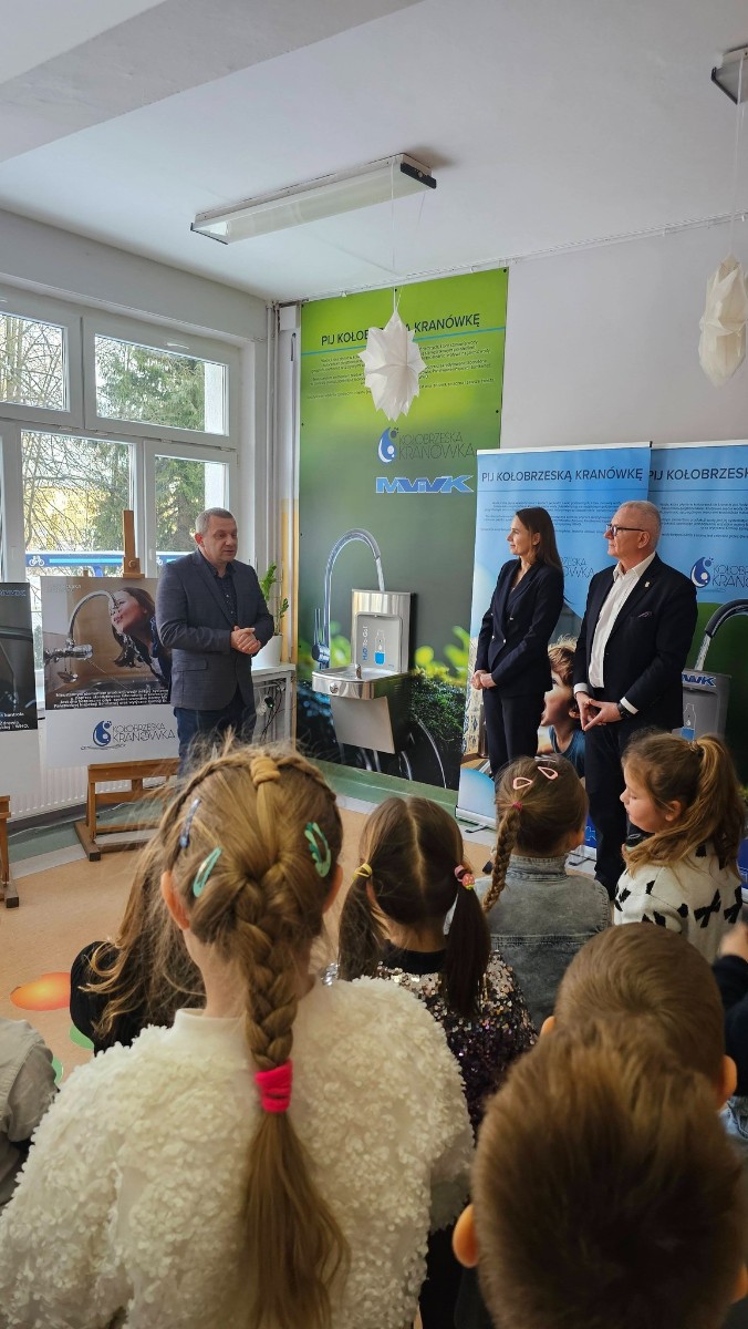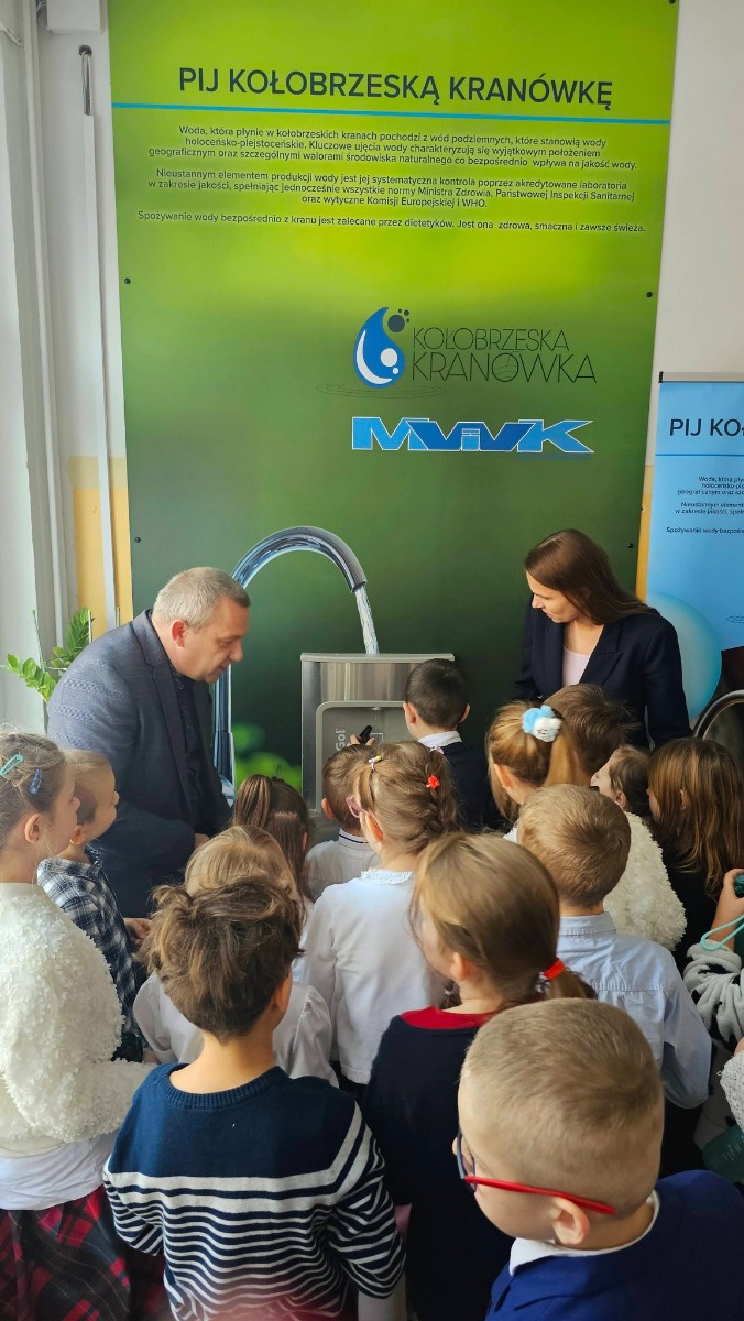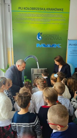 Prezes Zarządu „Miejskie Wodociągi i Kanalizacja” Sp. z o.o. w Kołobrzegu Rafał Piątkowski w ramach kampanii „Pij Kołobrzeską Kranówkę” przekazał społeczności uczniowskiej stację wody pitnej. W ten sposób uczniowie Szkoły Podstawowej nr 8 im.Kpt.żw Konstantego Maciejewicza mają zapewniony stały dostęp do świeżej, bezpiecznej i wysokojakościowej wody pitnej. Tym samym szkoła stała się kolejnym ważnym partnerem w realizacji naszej kampanii, w trakcie której propagujemy nie tylko picie wody prosto z kranu, ale także kształtujemy dobre nawyki żywieniowe oraz postawy proekologiczne, wspieramy edukację świadomego korzystania z zasobów wody.